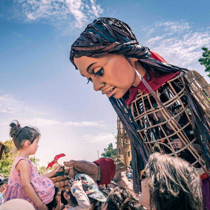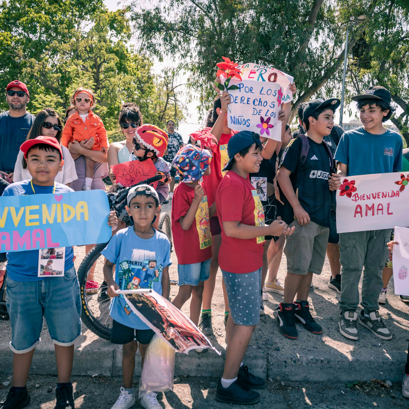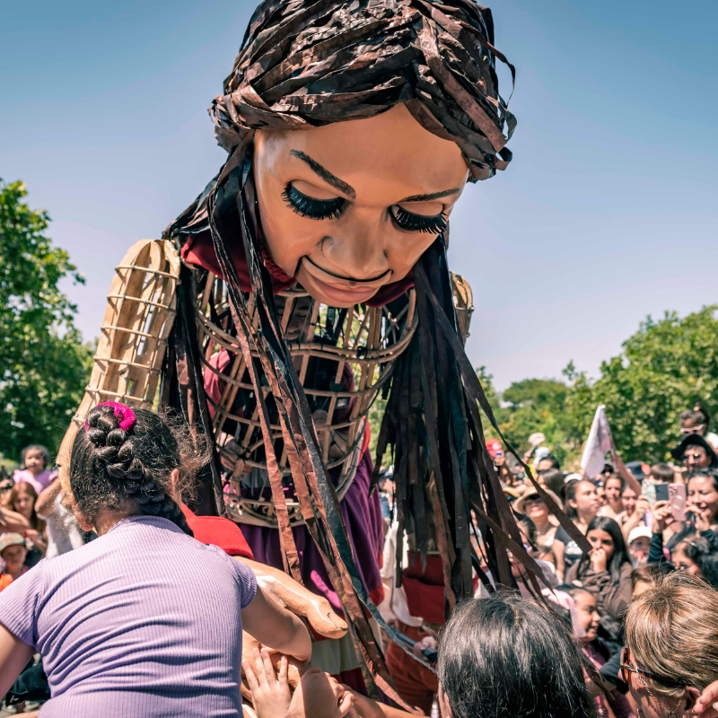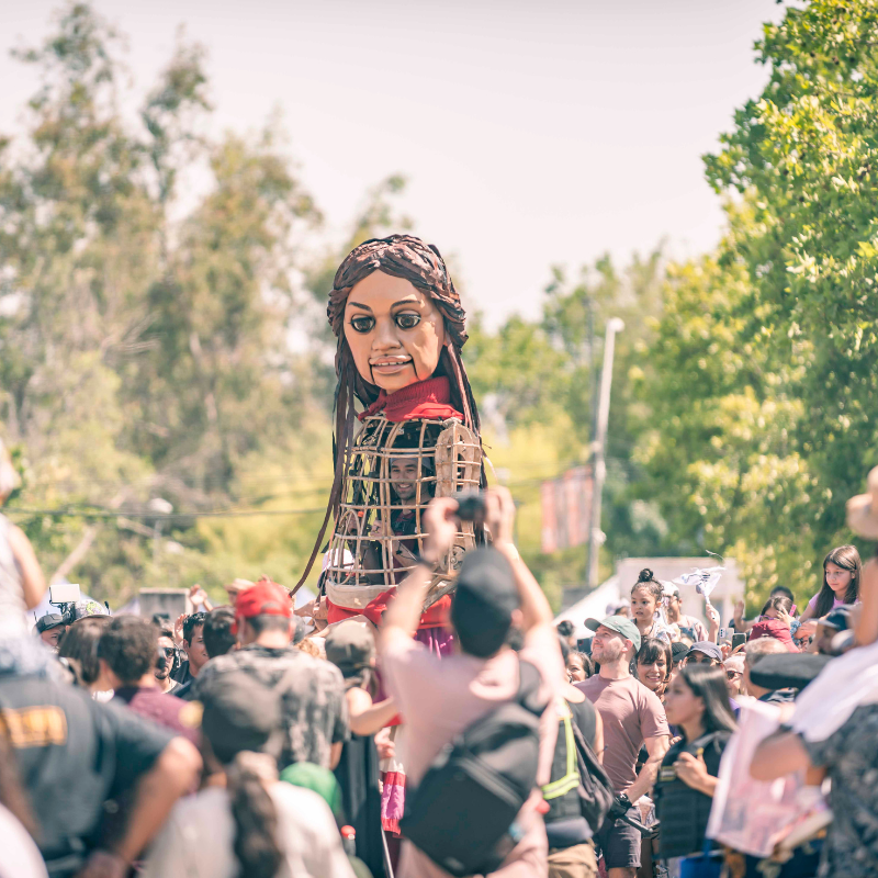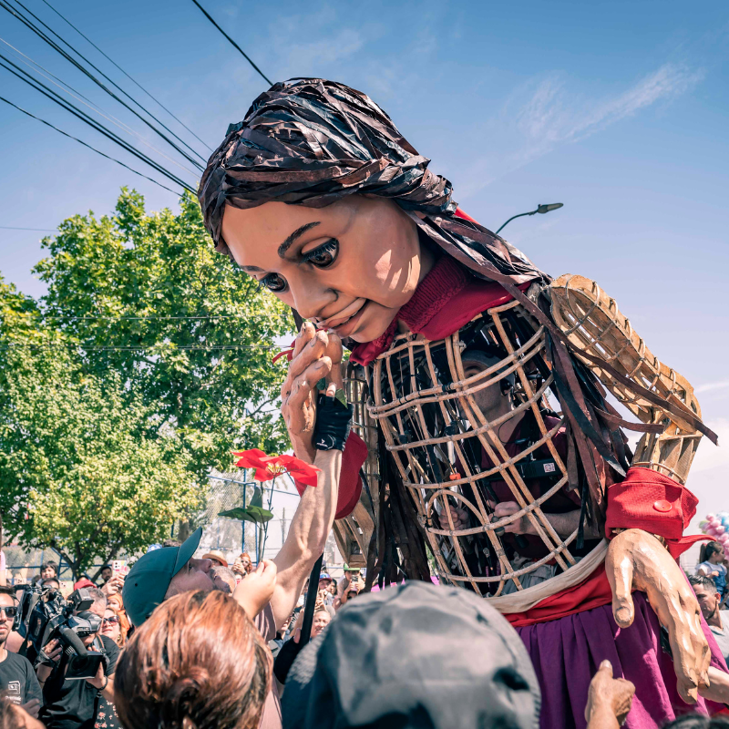 Cerca del mediodía, “Amal” apareció en nuestra comuna para saludar y compartir con los miles de vecinos y vecinas que fueron en masa a ser parte de esta espectacular obra de teatro callejero que es el corazón del proyecto The Walk (La caminata) un llamado de atención universal sobre los efectos de la inmigración, de los desplazados, de los niños que huyen de la guerra, de la violencia y la persecución.