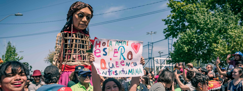 Cerca del mediodía, “Amal” apareció en nuestra comuna para saludar y compartir con los miles de vecinos y vecinas que fueron en masa a ser parte de esta espectacular obra de teatro callejero que es el corazón del proyecto The Walk (La caminata) un llamado de atención universal sobre los efectos de la inmigración, de los desplazados, de los niños que huyen de la guerra, de la violencia y la persecución.