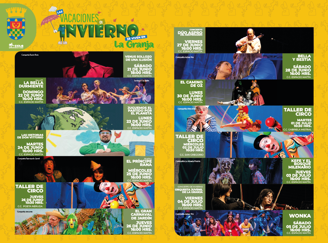 La Municipalidad de La Granja, a través de la Corporación Cultural Espacio Matta, invita a todas las familias de la comuna a disfrutar de una imperdible programación cultural y artística durante estas vacaciones de invierno.