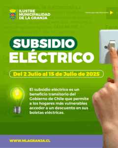 La Municipalidad de La Granja informa a las vecinas y vecinos que ya está disponible el proceso de postulación al Subsidio Eléctrico, un beneficio transitorio del Gobierno de Chile que busca aliviar el gasto en electricidad de los hogares más vulnerables del país.