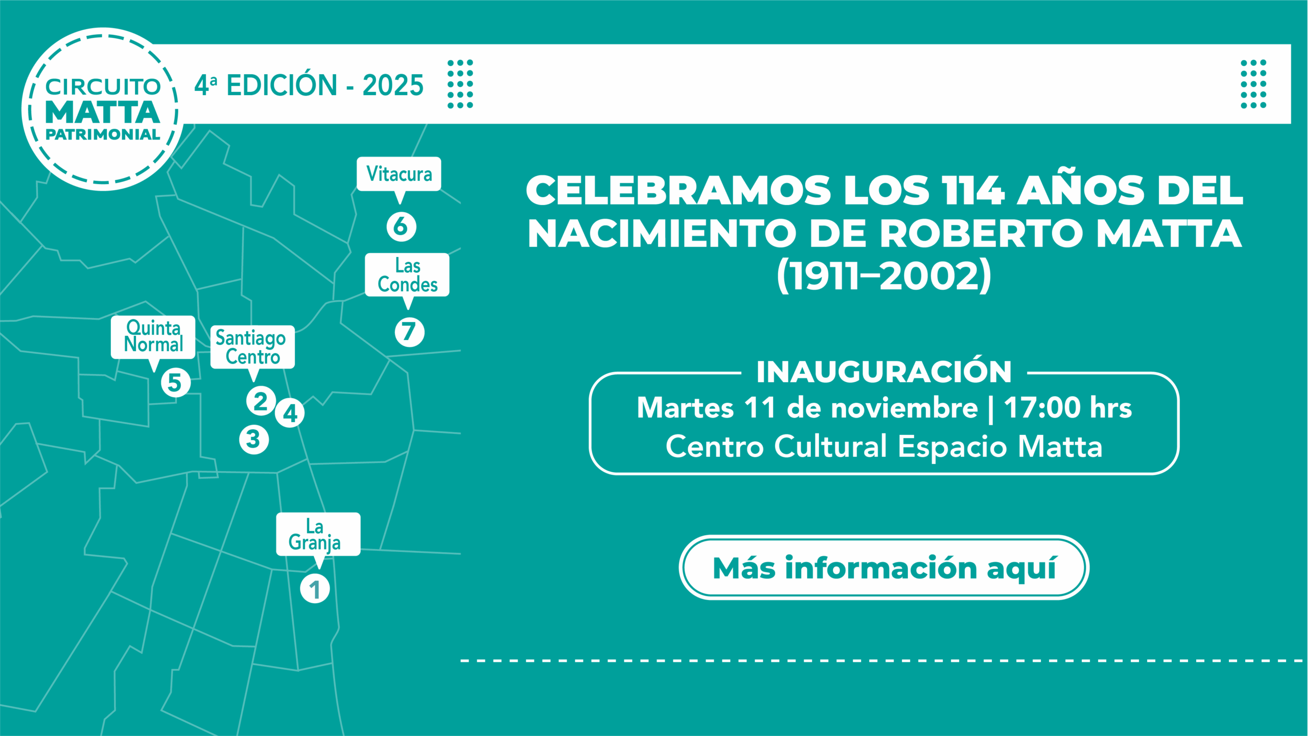 “Matta es un artista universal y parte del patrimonio de la humanidad. Pero, sobre todo, es patrimonio de Chile: de su gente, de su historia reciente y de su identidad. En este nuevo aniversario celebramos su mirada profundamente humanista, su pensamiento libre y crítico, su compromiso con la justicia social, valores que siguen inspirando a generaciones de creadores y comunidades en todo el país”, destaca la curadora Inés Ortega-Márquez, coordinadora del Circuito Matta Patrimonial. Por su parte, el alcalde de La Granja y presidente de la Corporación Cultural, Claudio Arriagada Macaya, subraya el valor que esta iniciativa tiene para el territorio: “Roberto Matta no solo representa la excelencia artística de Chile, sino también la convicción de que la cultura debe estar al alcance de todos. Su legado nos inspira a seguir construyendo una comuna donde el arte dialogue con la vida cotidiana, donde cada vecino y vecina tenga la oportunidad de encontrarse con la creación, la reflexión y la belleza. Desde La Granja, seguimos fortaleciendo ese sueño de una cultura viva, democrática y profundamente humana”.